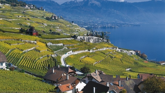 View of Rivaz and the Lavaux vineyards, part of the UNESCO World Heritage, on the Canton Vaud side of Lake Geneva.